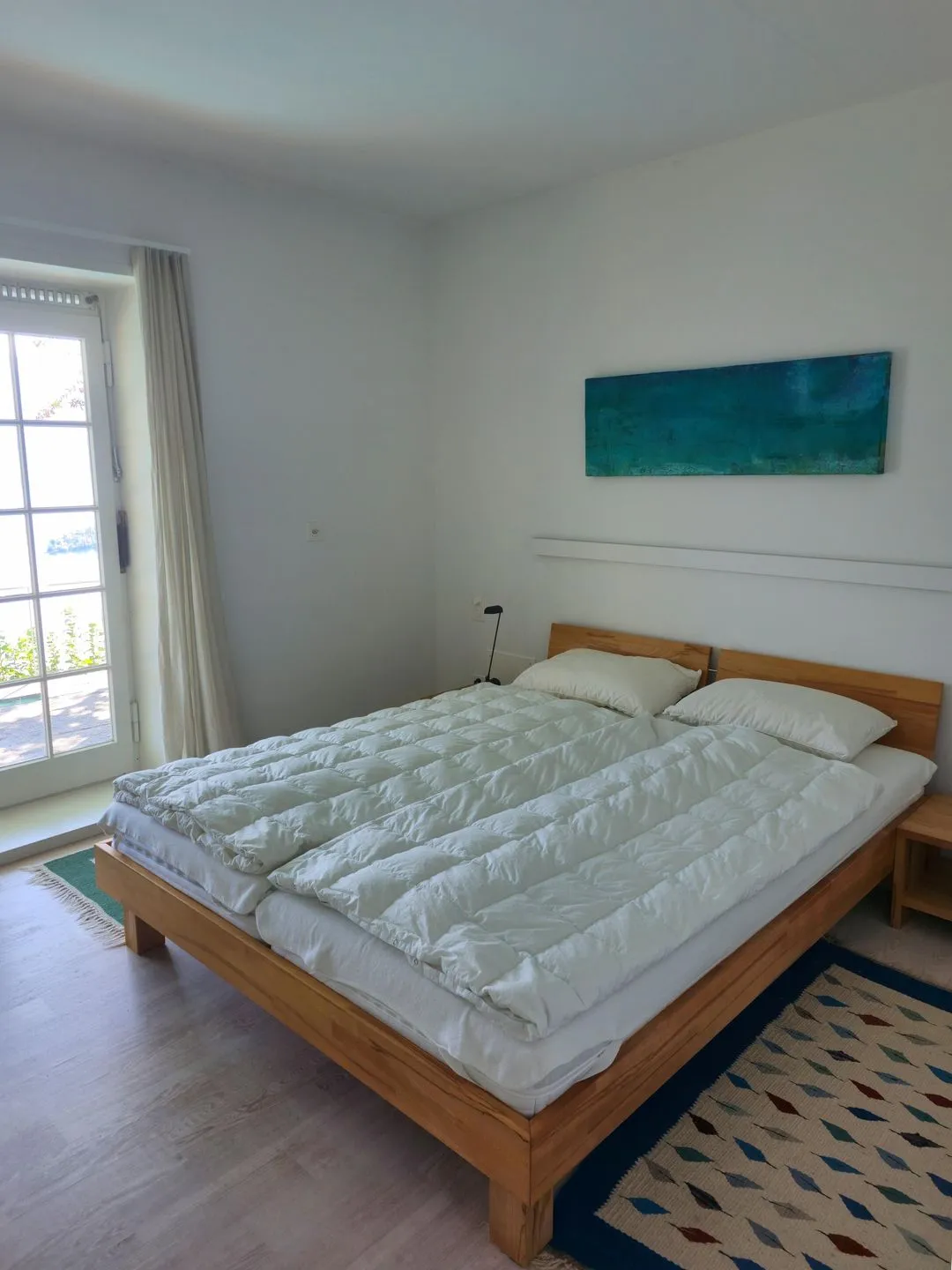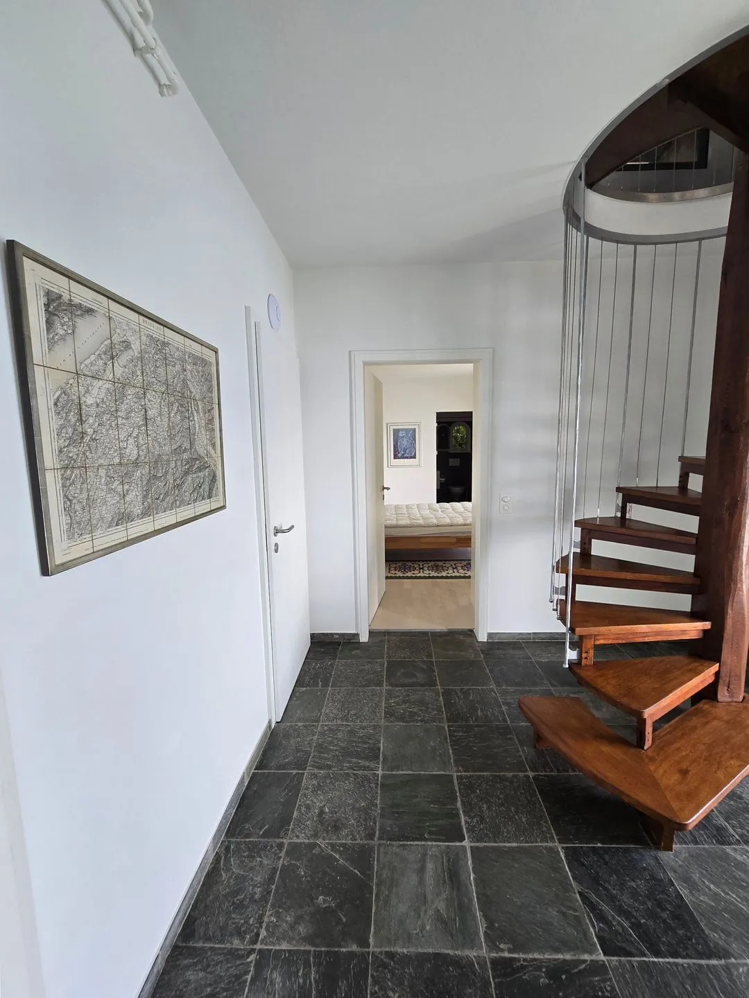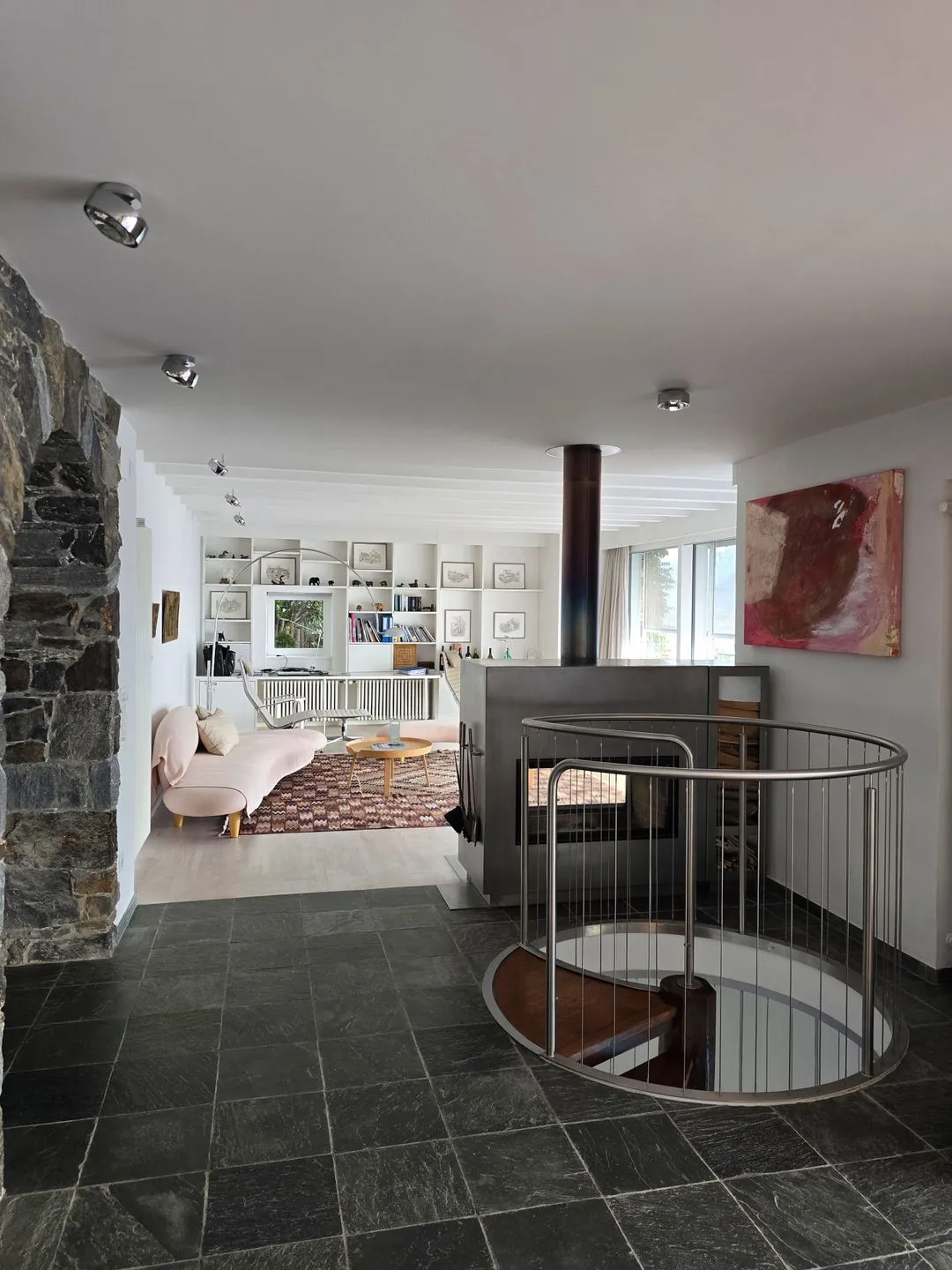 Im Inneren punktet die Villa durch ein stilvolles, modernes Ambiente mit hochwertigen Ausstattungsdetails. Im Erdgeschoss erwartet Sie ein lichtdurchflutetes Wohnzimmer mit Naturstein- und Parkettboden, gemütlicher Sofaecke, Sessel und Zugang zur Terrasse. Das Raumklima wird ganzjährig durch eine umweltfreundliche Wärmepumpenheizung und Fussbodenheizung angenehm reguliert, während Fliegengitter, Markise und überdachte Terrasse/Balkon für zusätzlichen Wohnkomfort sorgen. Für Ihre Unterhaltung und zum Entspannen stehen Bücher zur Auswahl. Ein TV ist in der Villa nicht vorhanden, wodurch Ruhe, Natur und gemeinsame Zeit in den Mittelpunkt rücken.