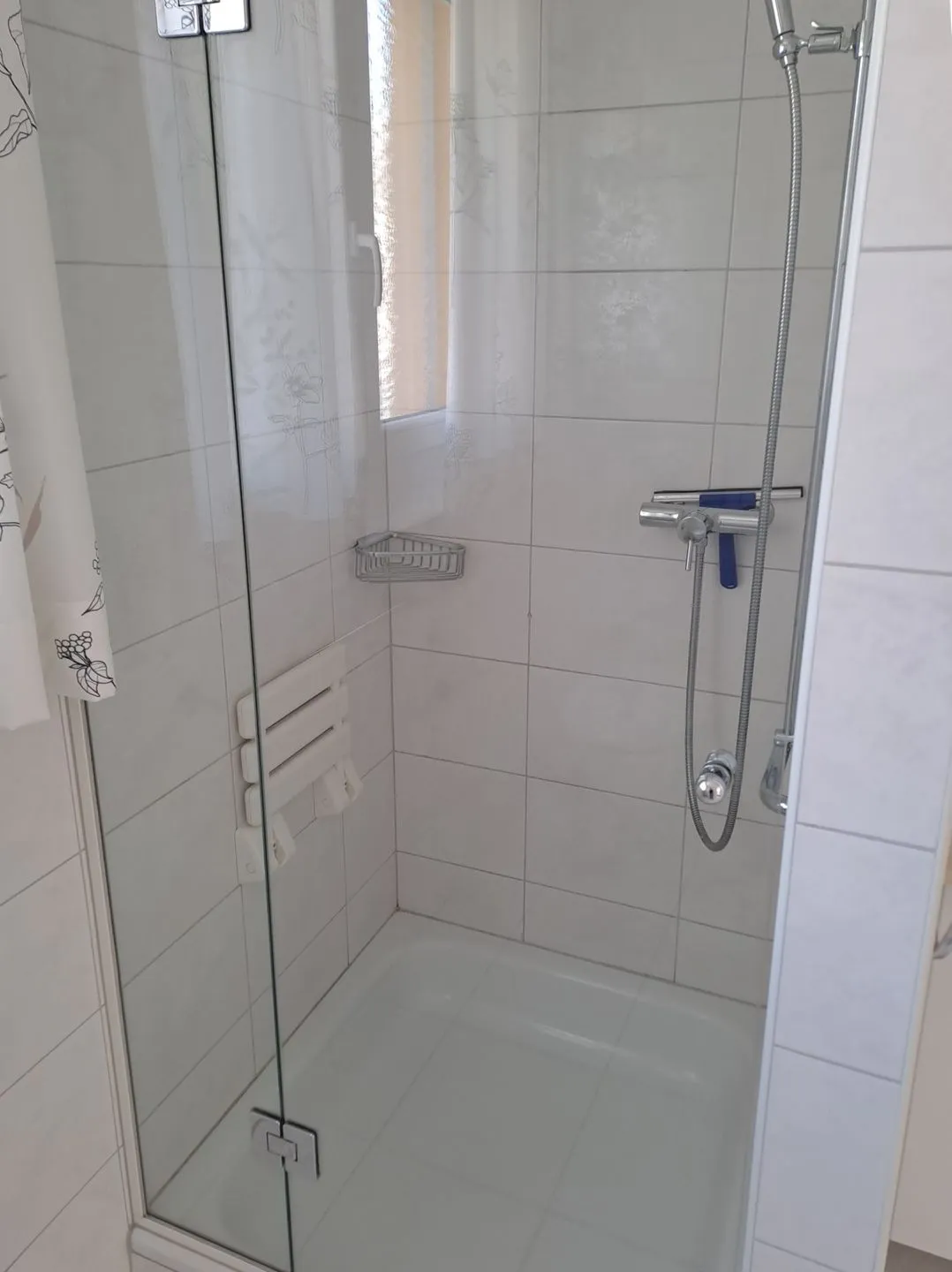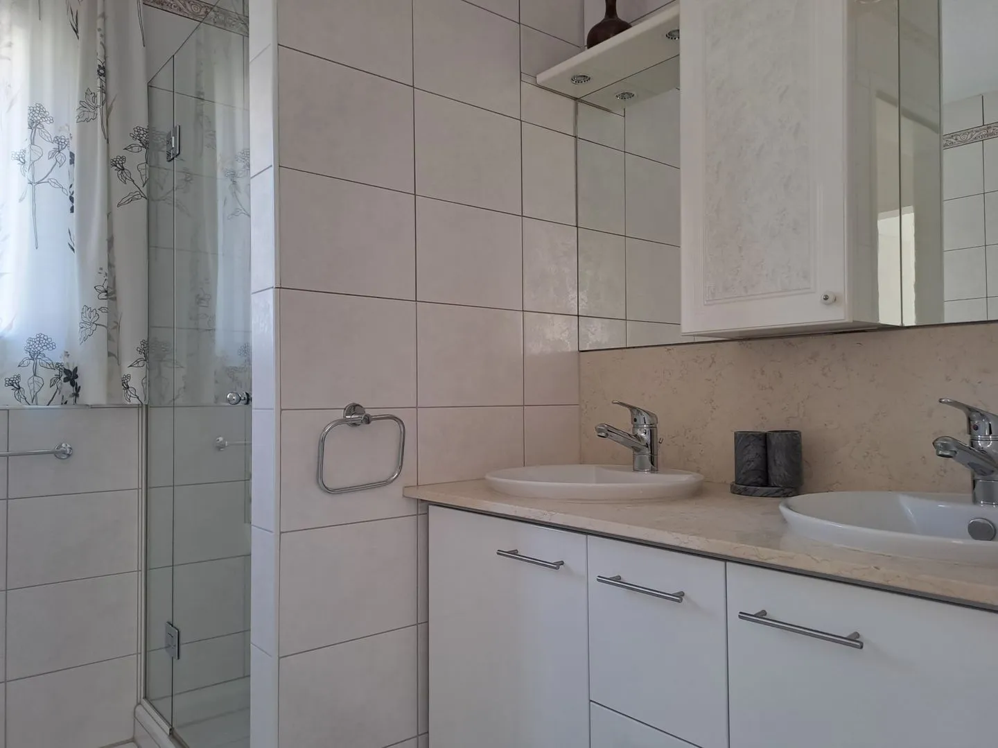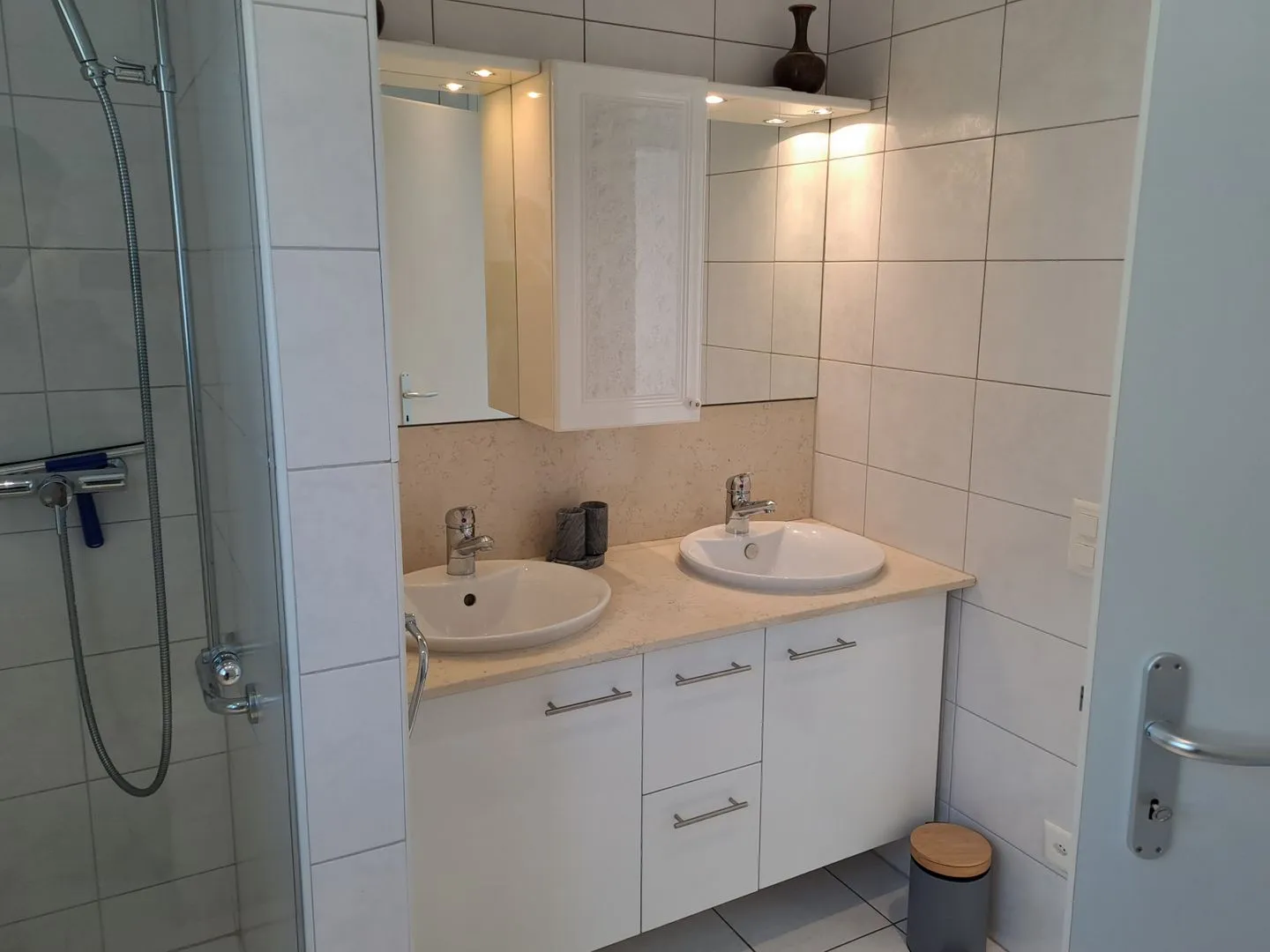 The elegant bathroom offers both a bathtub and a walk-in, ground-level shower, along with a washbasin, large mirror, window, hairdryer, and all necessary sanitary installations. An additional guest WC further increases convenience, particularly for families and groups.
