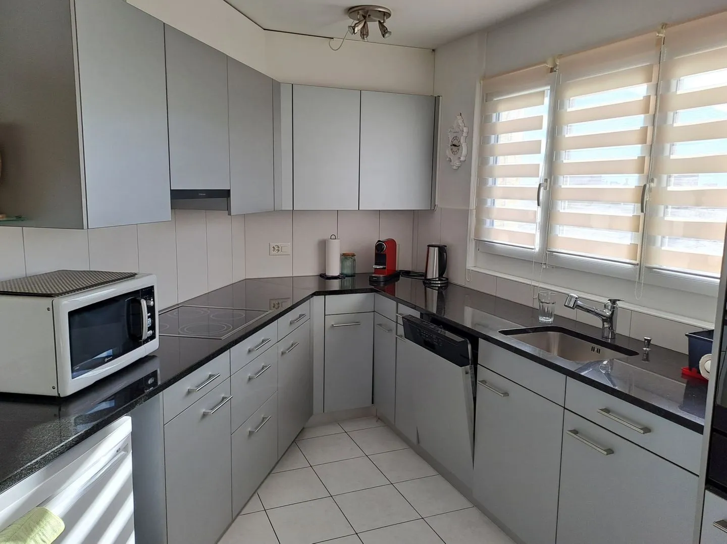 The modern open kitchen is extensively appointed, featuring a ceramic stove, electric oven, microwave, fridge with freezer compartment, dishwasher, Nespresso coffee machine, kettle, toaster, and a comprehensive selection of cooking utensils, dishes, and cutlery. Basic spices and kitchen towels are also provided. The adjacent dining area seats the whole family conveniently for shared meals.