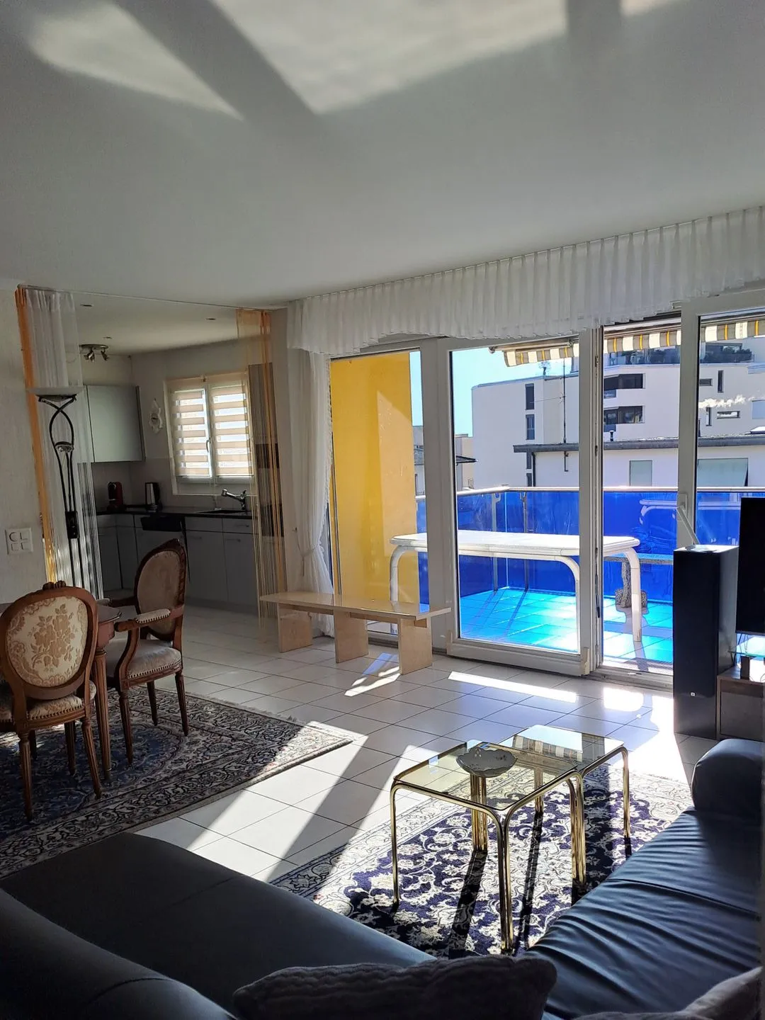 The apartment is thoughtfully designed and features a spacious living room with high-quality tiled flooring and an inviting sofa area, complemented by a satellite TV (with international channels), HiFi system, and radio for your entertainment needs. The living room seamlessly connects to the open-plan kitchen and dining area, ensuring sociability and a natural flow of light, especially from the adjoining covered balcony or terrace. From here, guests can marvel at the “good” views of both the lake and the surrounding mountains, providing a tranquil backdrop for relaxation.