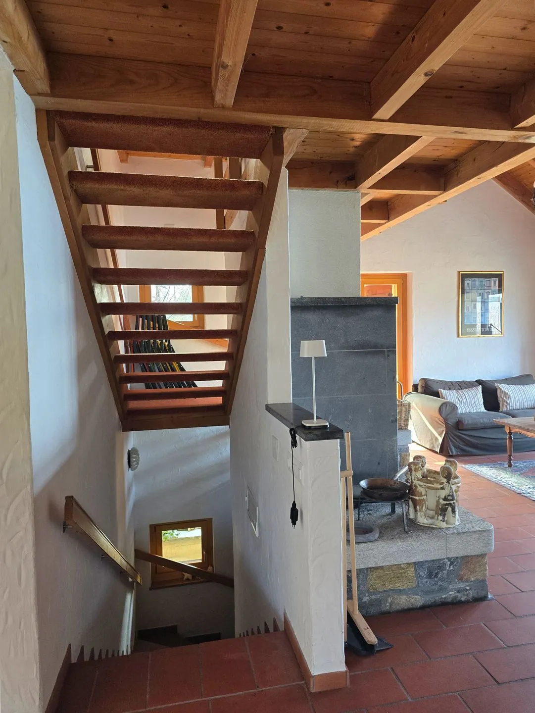 Das Haus erstreckt sich über 3 Etagen (Eingang auf der Ebene 1. Stock) und wurde zuletzt 2014 renoviert. Für angenehmes Wohnklima sorgen Heizung (Öl) sowie Fußbodenheizung, und an kühleren Abenden schafft der Kaminofen eine besonders behagliche Atmosphäre. Im Wohnbereich laden Sofaecke, Sessel und Sofa zum Entspannen ein, begleitet von Unterhaltung mit 2 TVs (Satellit, internationale Kanäle), Radio, CD-Spieler sowie einer Auswahl an Büchern und Spielen. WLAN und Internet stehen selbstverständlich zur Verfügung; ein Schreibtisch macht die Casa Arcana auch für Tage mit etwas „Work & Relax“ passend.