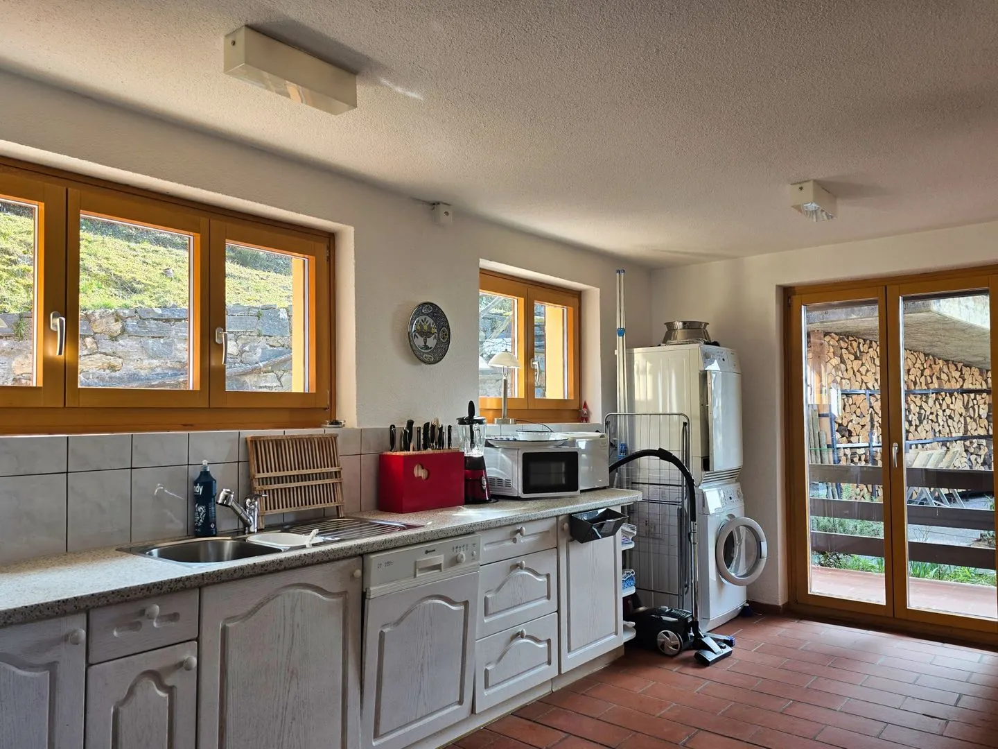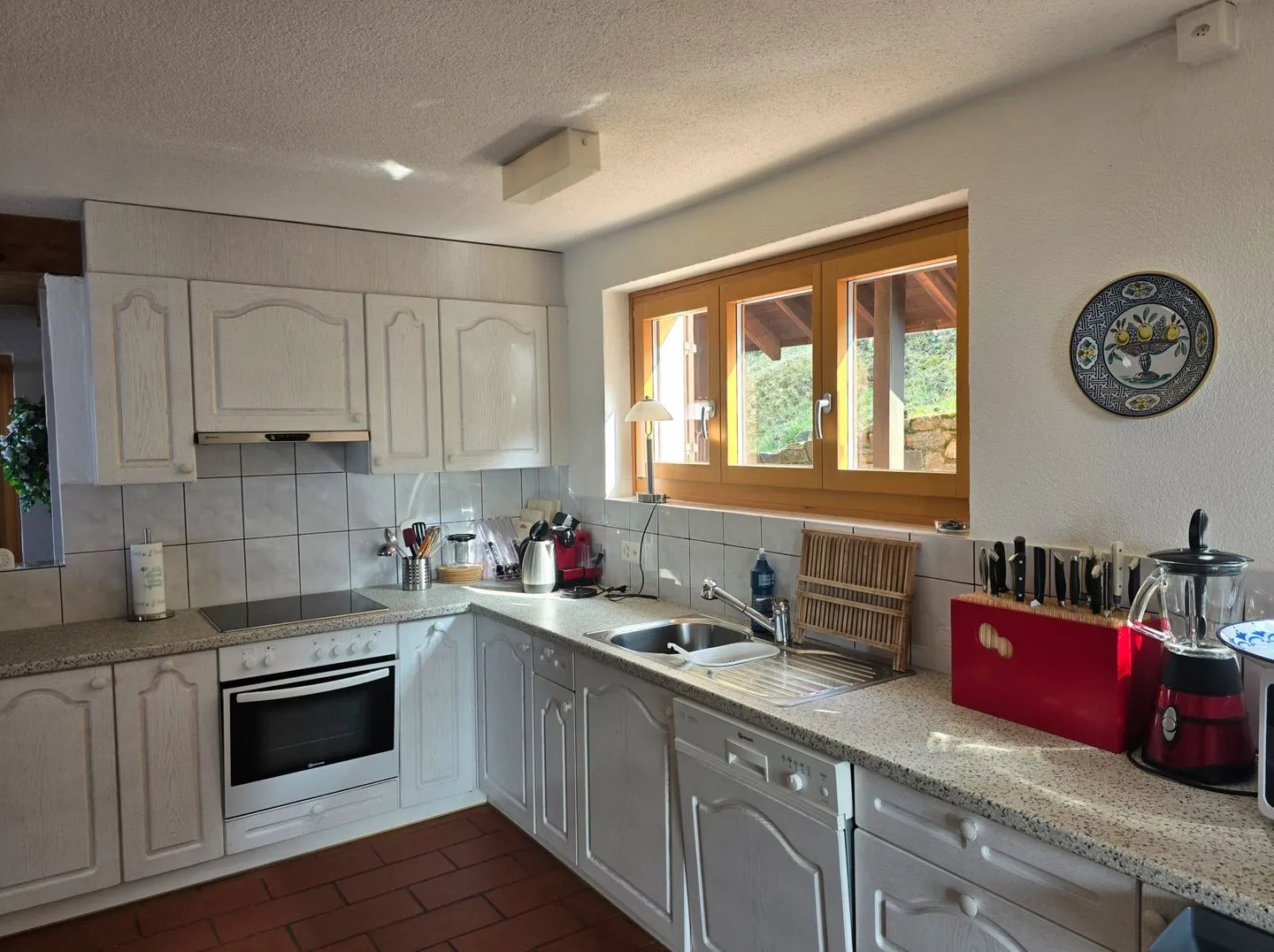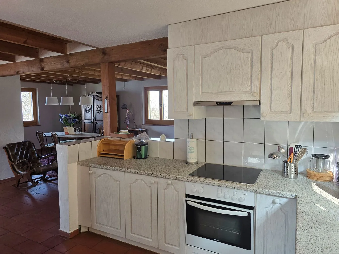 Die Küche ist voll ausgestattet und auf entspanntes Kochen ausgelegt: 4-Platten-Herd, Backofen, Kühlschrank mit Gefrierfach, Spülmaschine, Wasserkocher, Mixer und Küchenmaschine sowie Küchenutensilien, Geschirr und Besteck sind vorhanden. Für Kaffeegenuss nach Wunsch stehen Kaffeemaschine und eine Nespresso-Espressomaschine bereit, dazu Geschirrhandtücher und praktische Details wie Abfalleimer. Der Essbereich mit Esstisch verbindet die Küche mit dem geselligen Teil des Hauses.